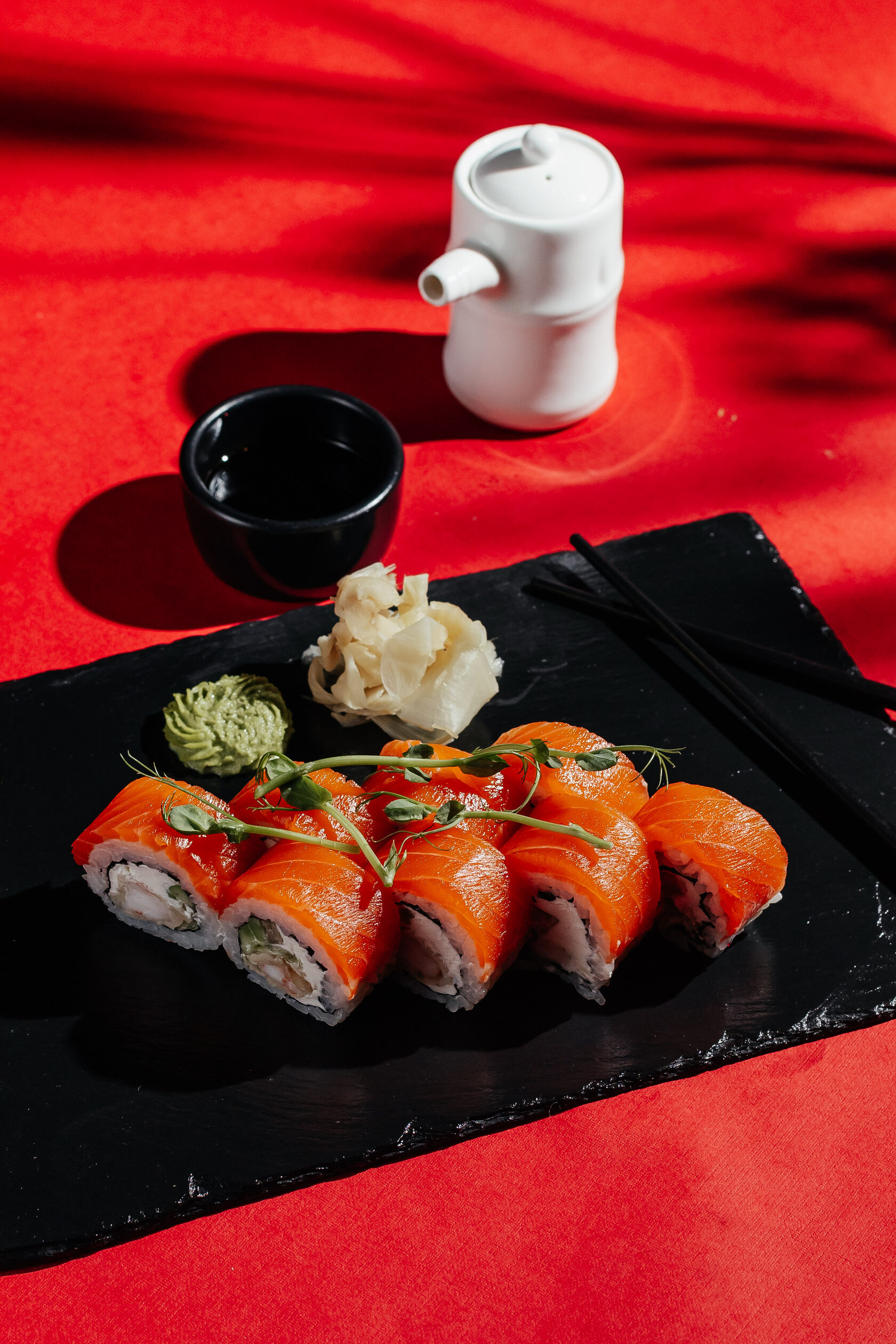 рис, листья нори, лосось терияки, сливочный сыр, огурец, кунжут, имбирь, васаби, соевый соус